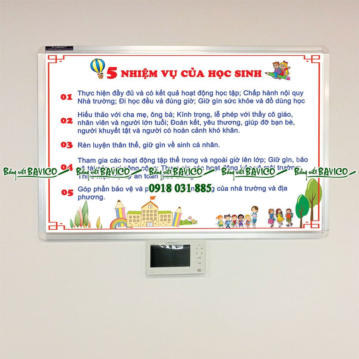 Mặt bảng 5 nhiệm vụ của học sinh: được dán pp nội dung 5 nhiệm vụ của học sinh trên nền bảng trắng bằng Polyester của Taiwan, lau sạch bóng.