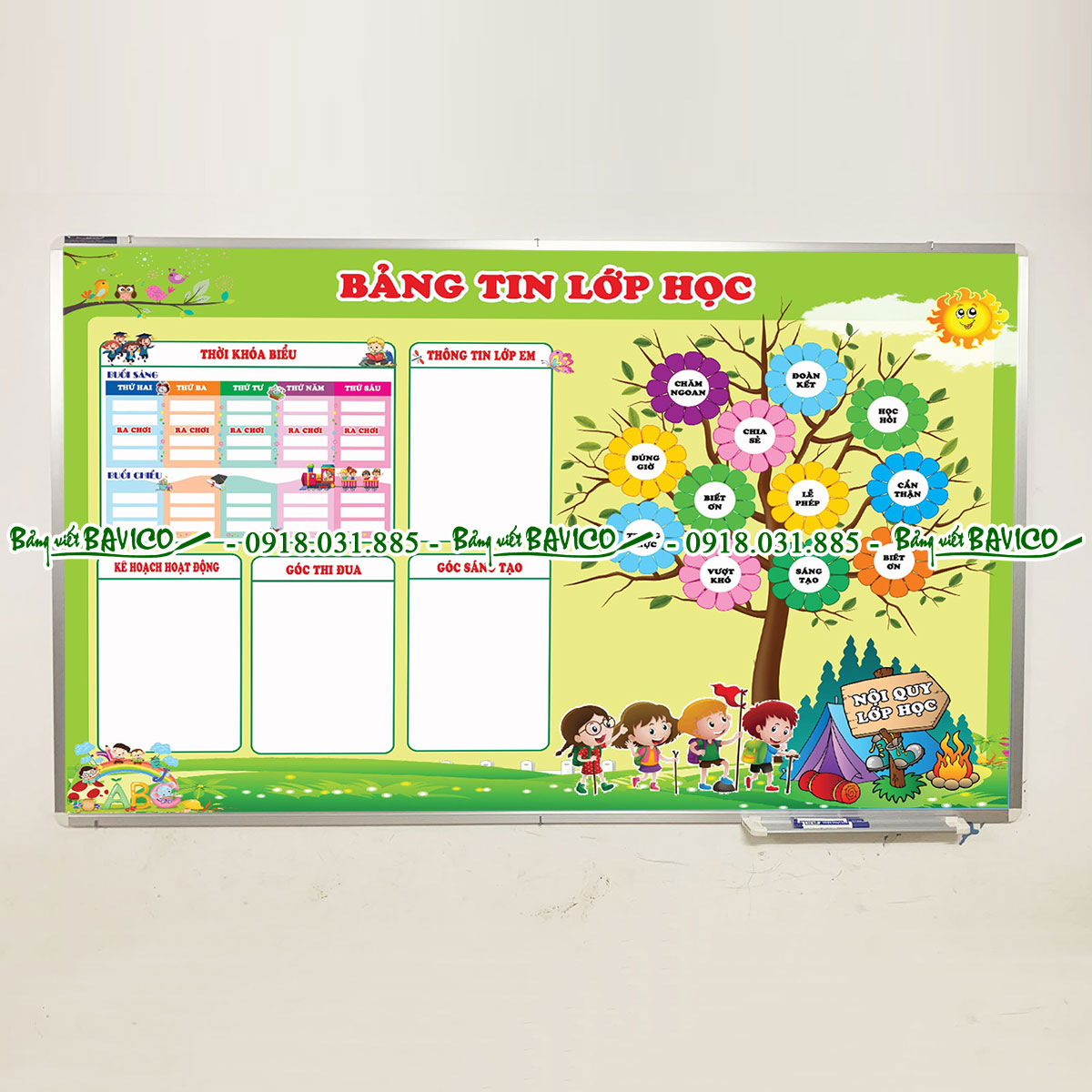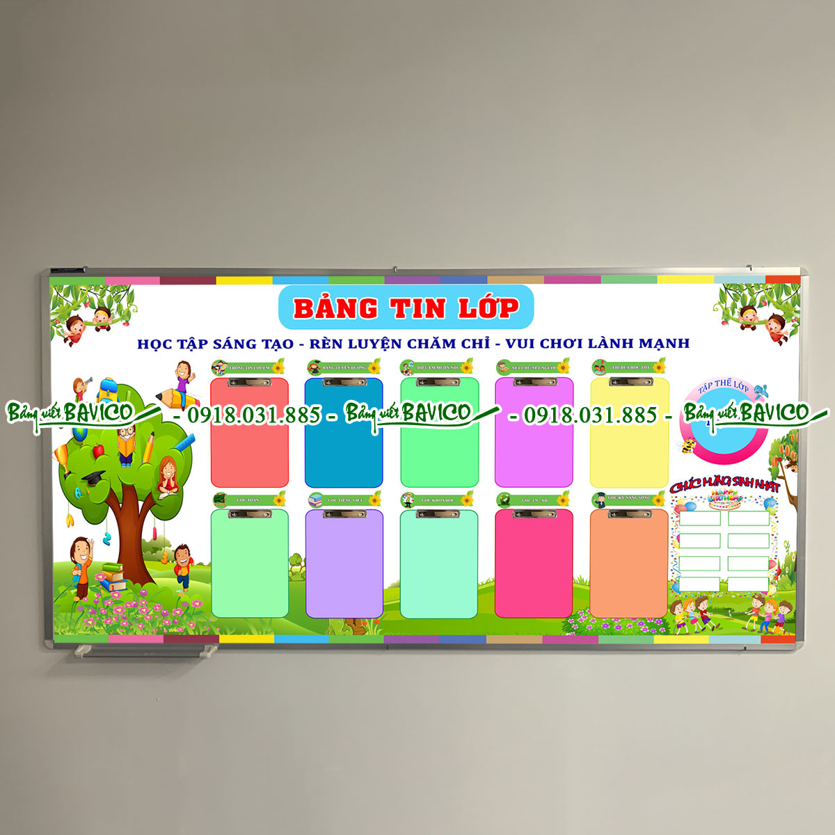 Bảng tin lớp được thiết kế và sản xuất tại công ty Bavico với hình ảnh sinh động sắc nét, dán pp trên nền bảng trắng sử dụng lâu mà không bị hư hỏng hơn nữa có thể di chuyển bảng từ vị trí này sang vị trí khác.