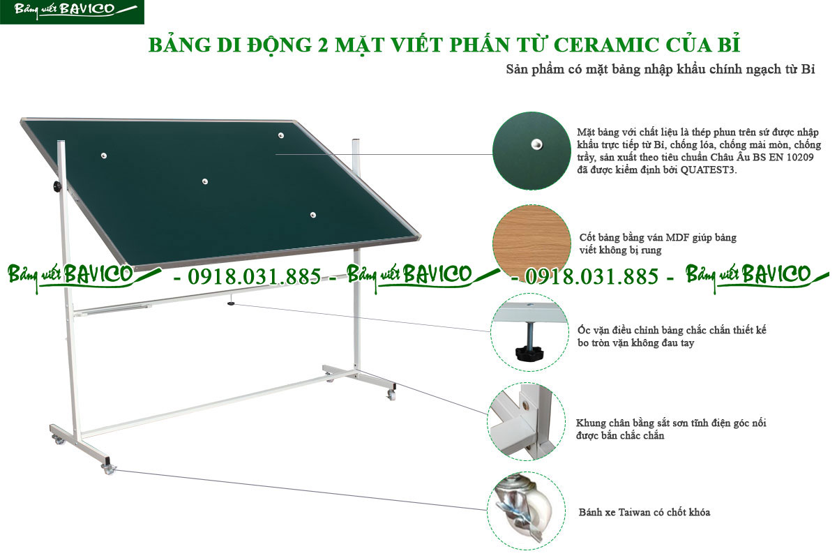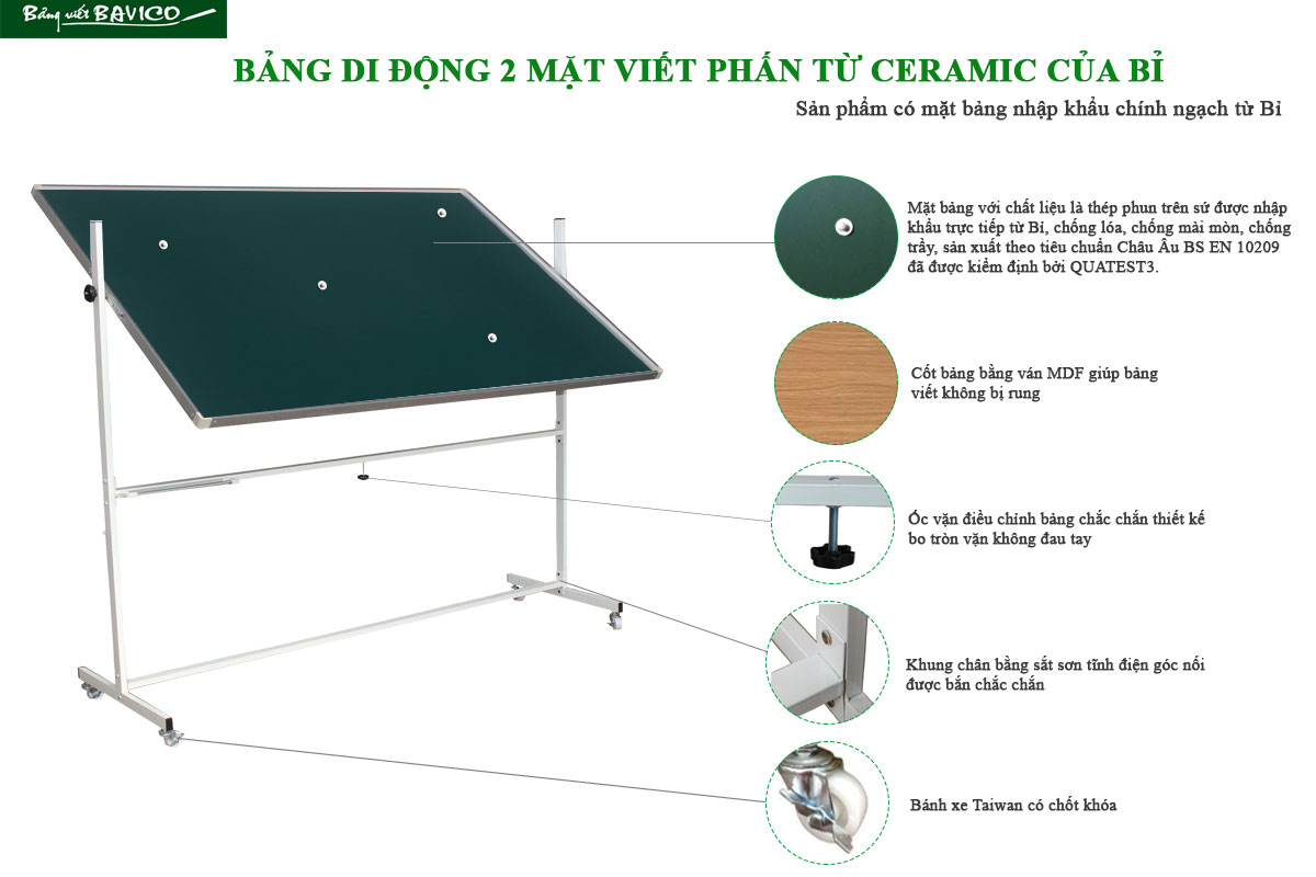 1/Mặt bảng dạy học có chân di động viết phấn từ Ceramic: với chất liệu là thép phun trên sứ được nhập khẩu trực tiếp từ Bỉ, sản xuất theo tiêu chuẩn Châu Âu BS EN10209 và đã được kiểm định bởi QUATEST3 với đặt tính nổi bật: