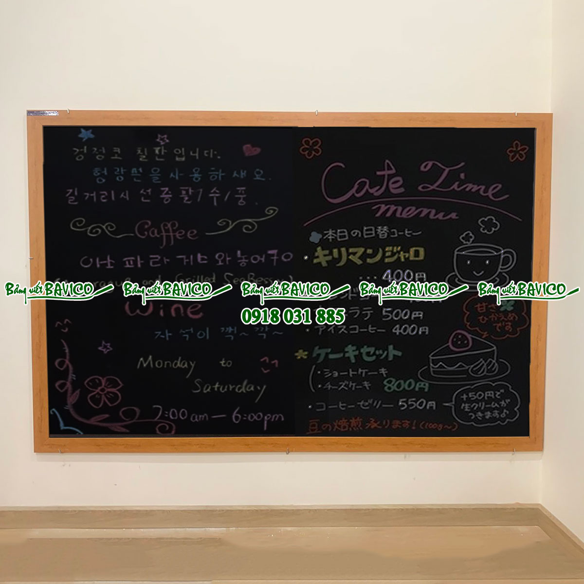 Bảng đen menu khung gỗ viết phấn treo tường dùng viết menu cho các quán cà phê hay quán ăn bằng phấn màu.
