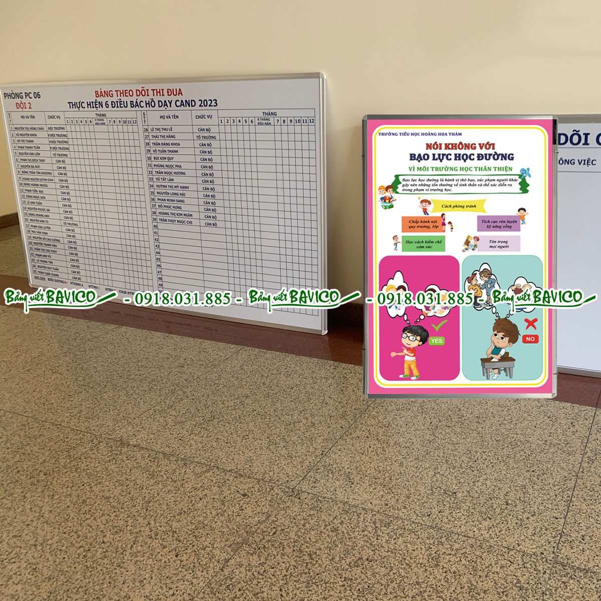 1/ Mặt Bảng biểu nói không với bạo lực học đường có phần mặt bảng được dán pp nội dung trên nền tấm bảng trắng bằng Polyester của Taiwan, lau sạch bóng.
